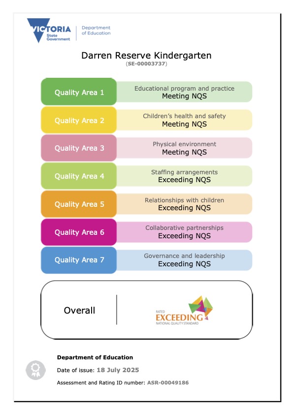 We received an overall rating of 'Exceeding the Standard'. We are proud to have achieved the rating of Exceeding in 4 quality areas – Relationships with Children, Staffing Arrangements, Collaborative Partnerships and Governance and Leadership.